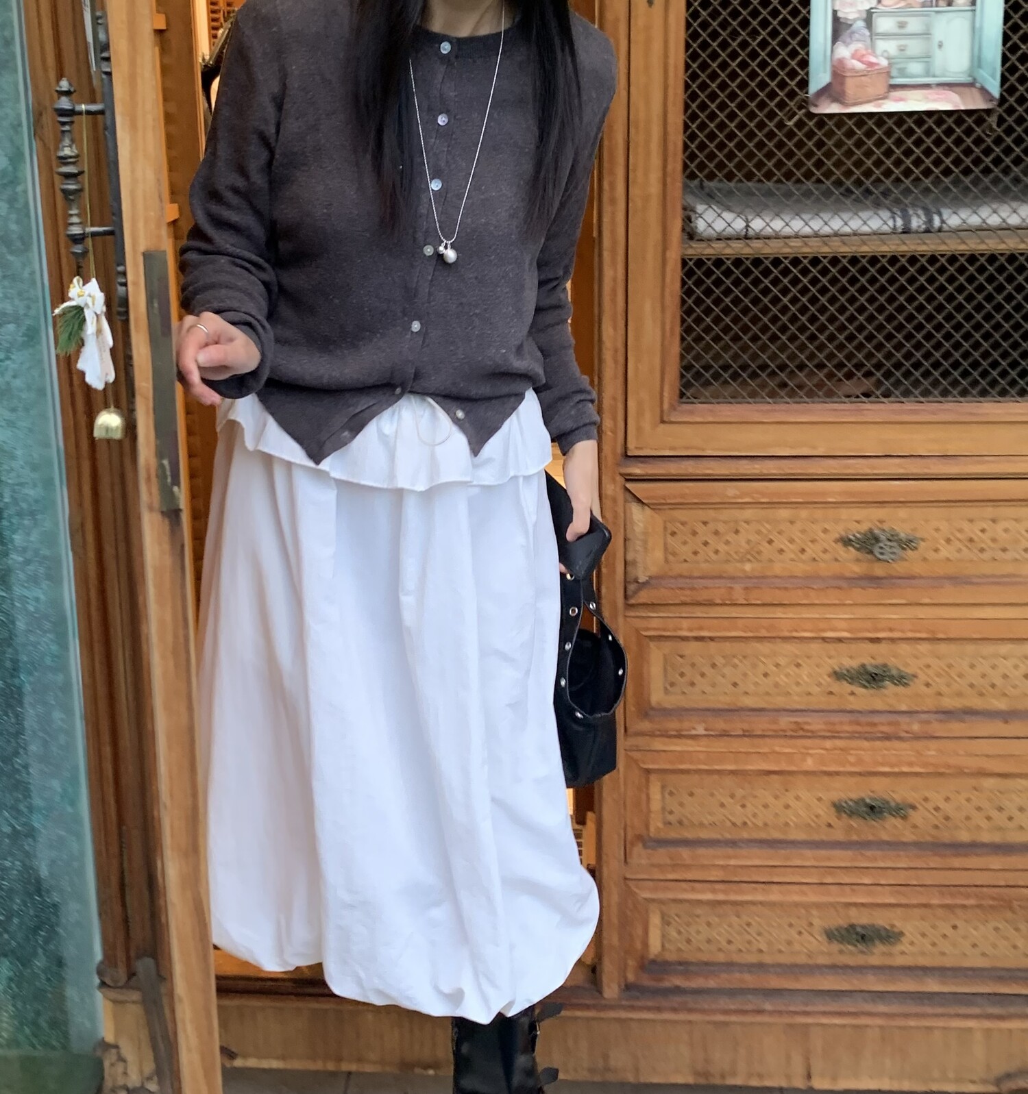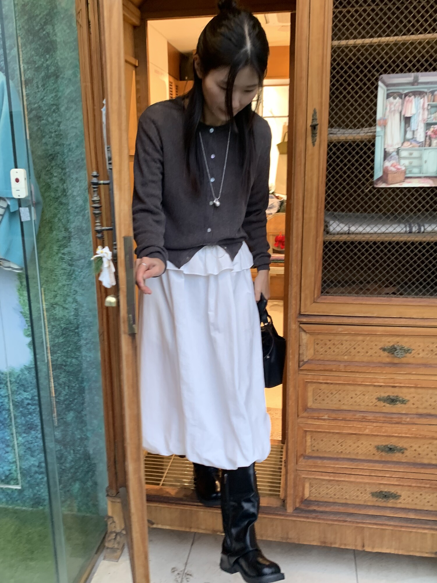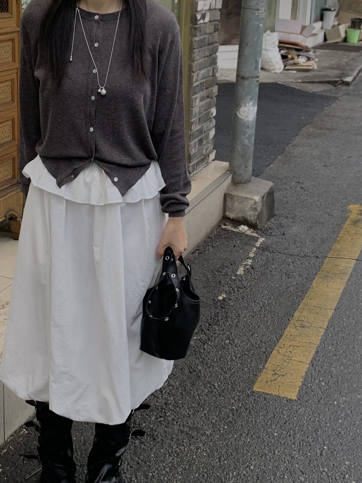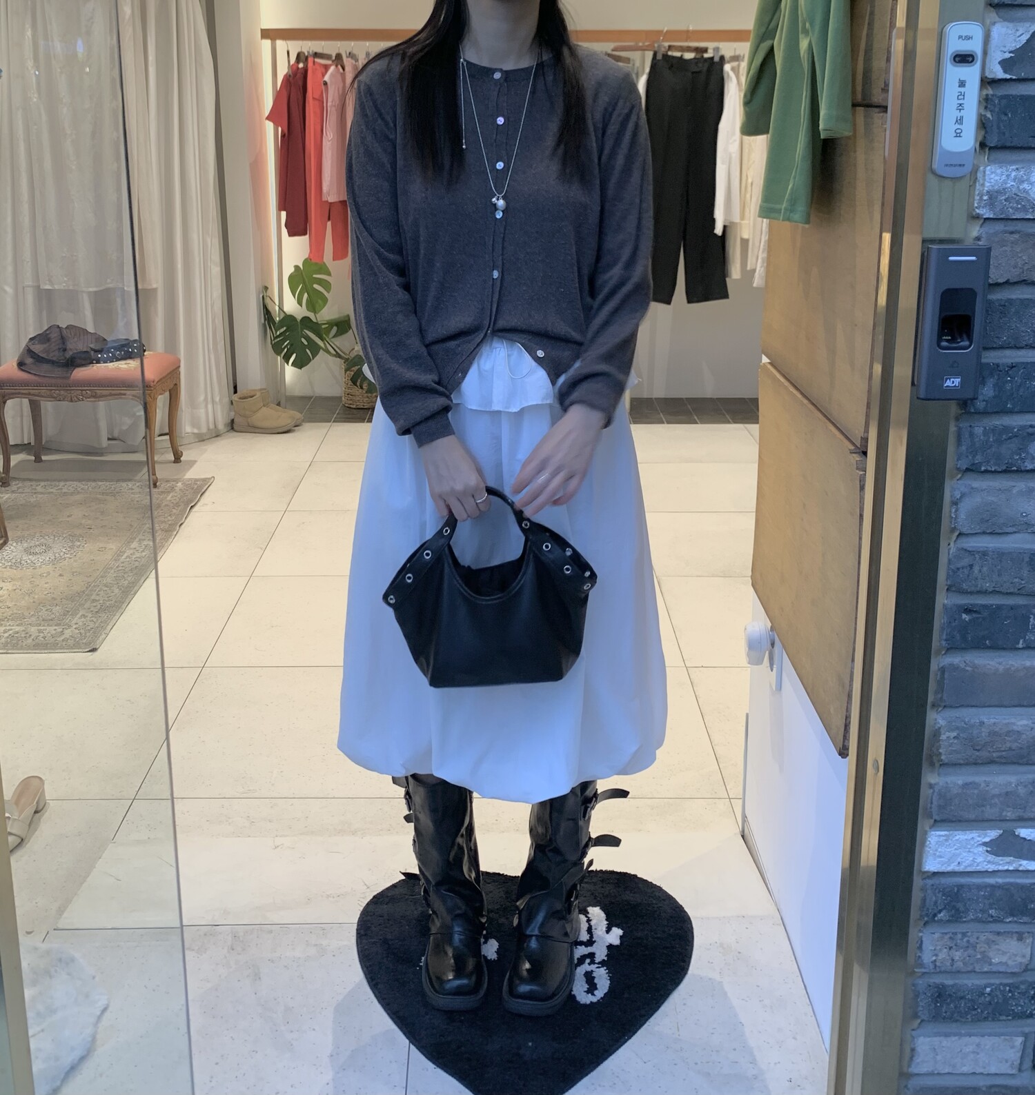 아방한 핏의 스커트를 착용하였을 때 무릎 밑의 기장감으로 떨어져 아담하신 분들도