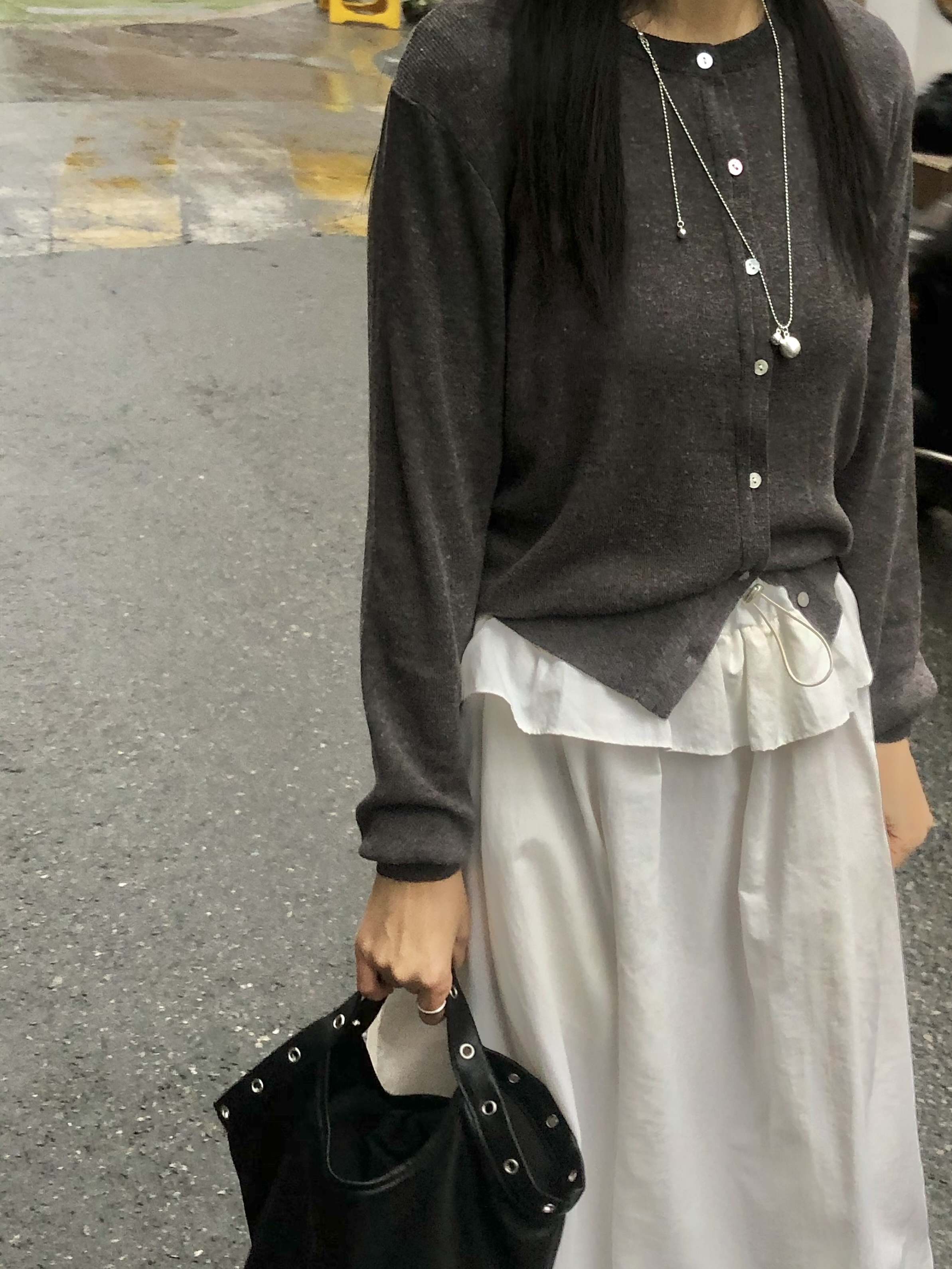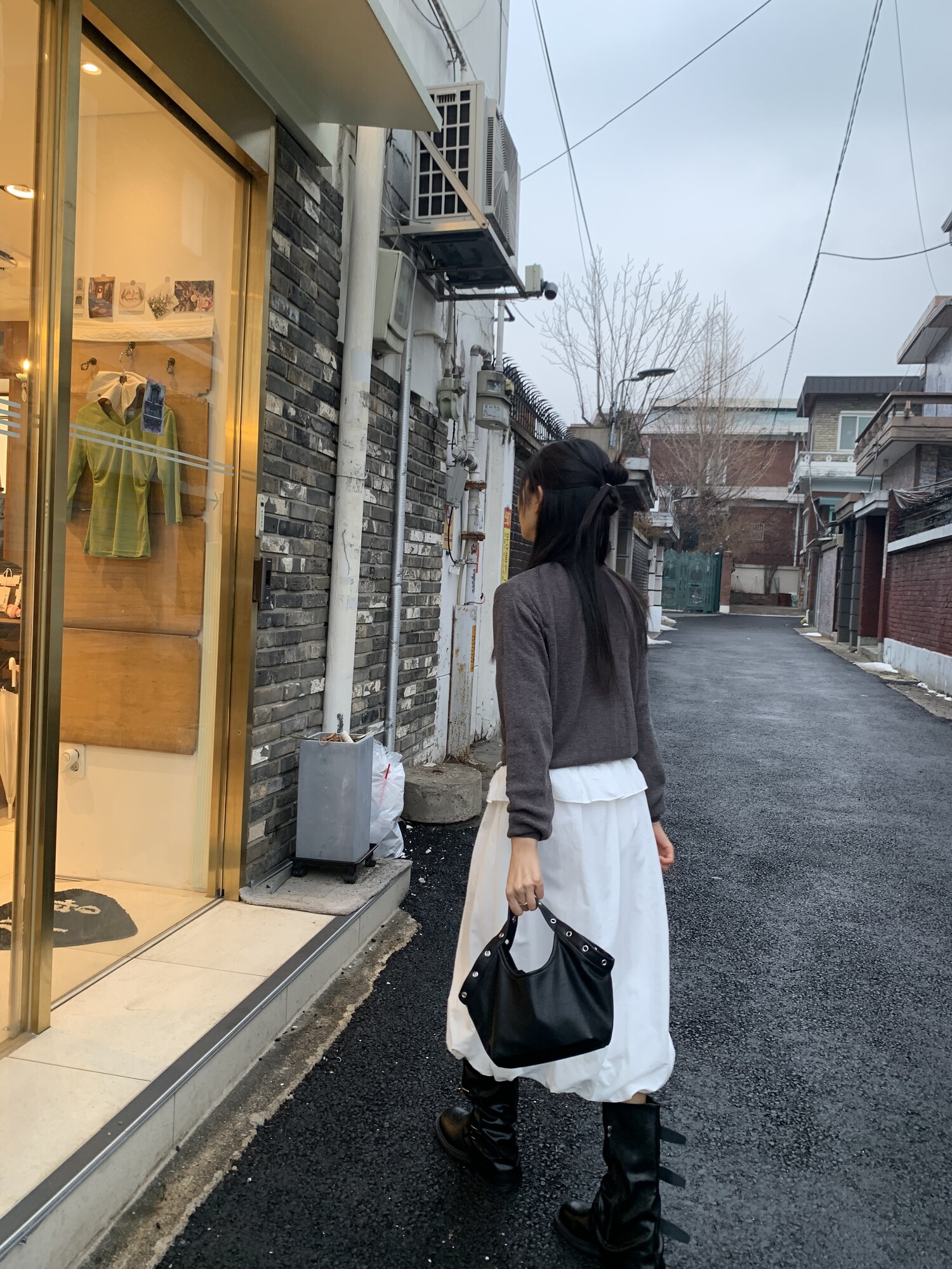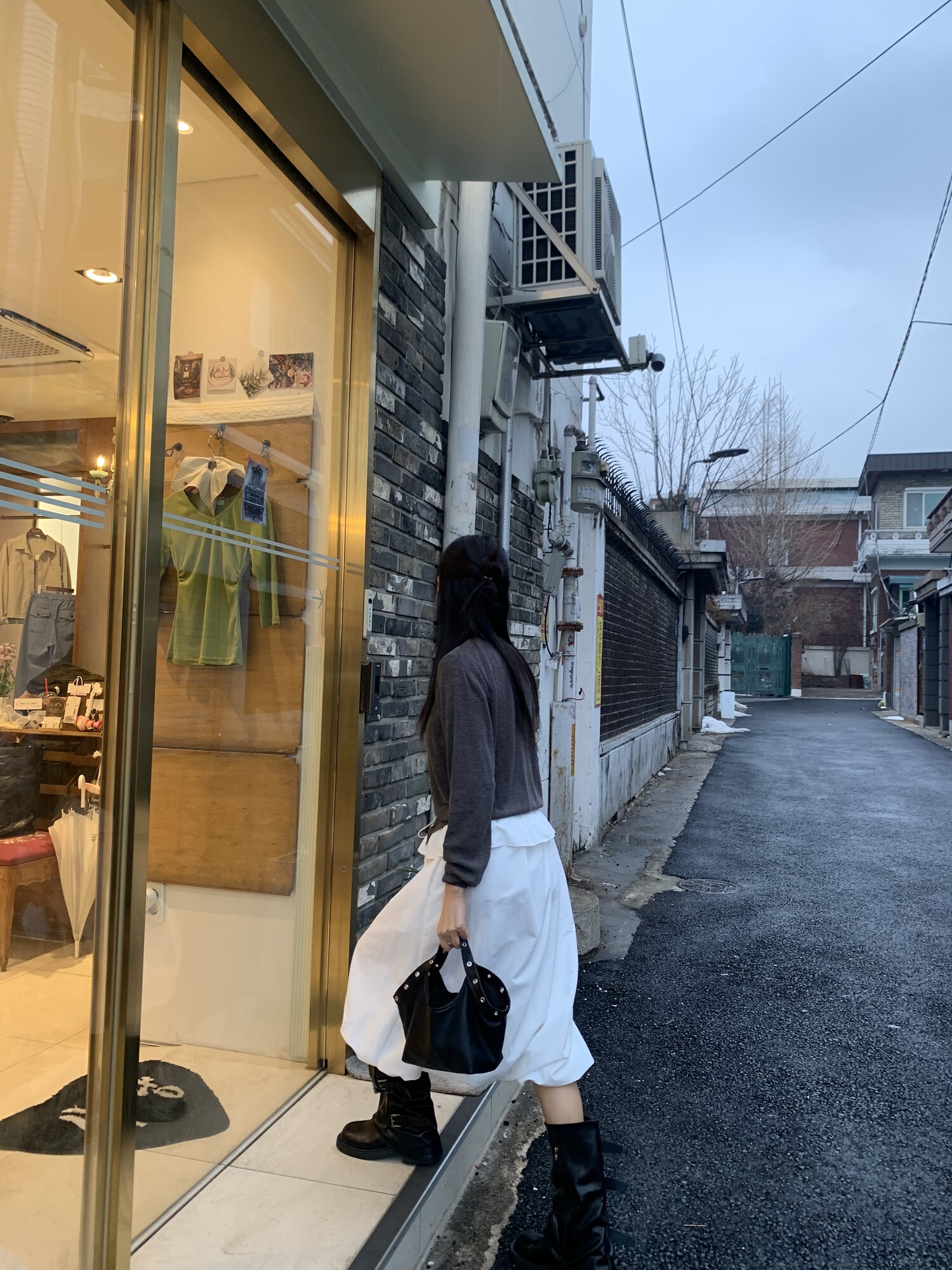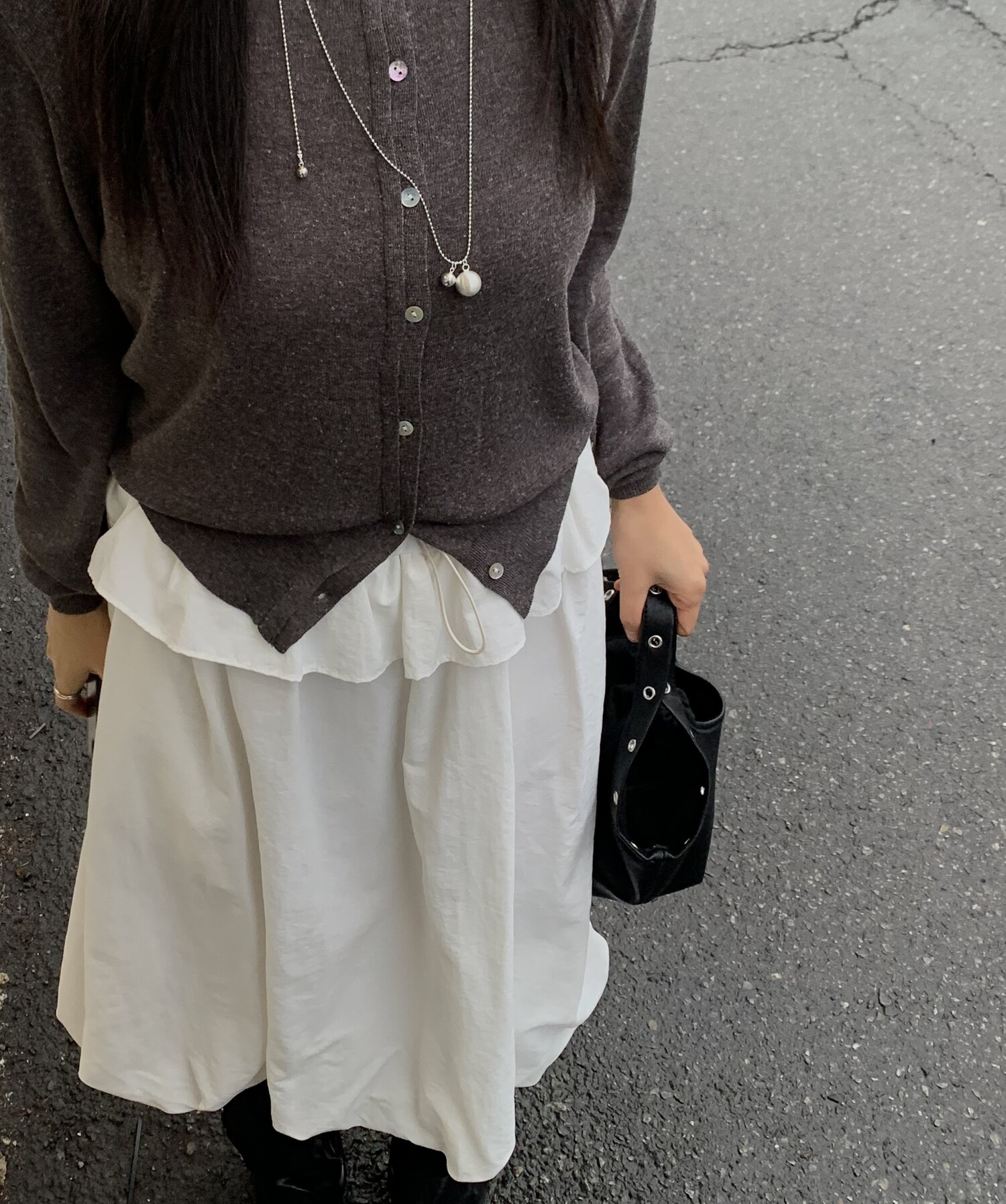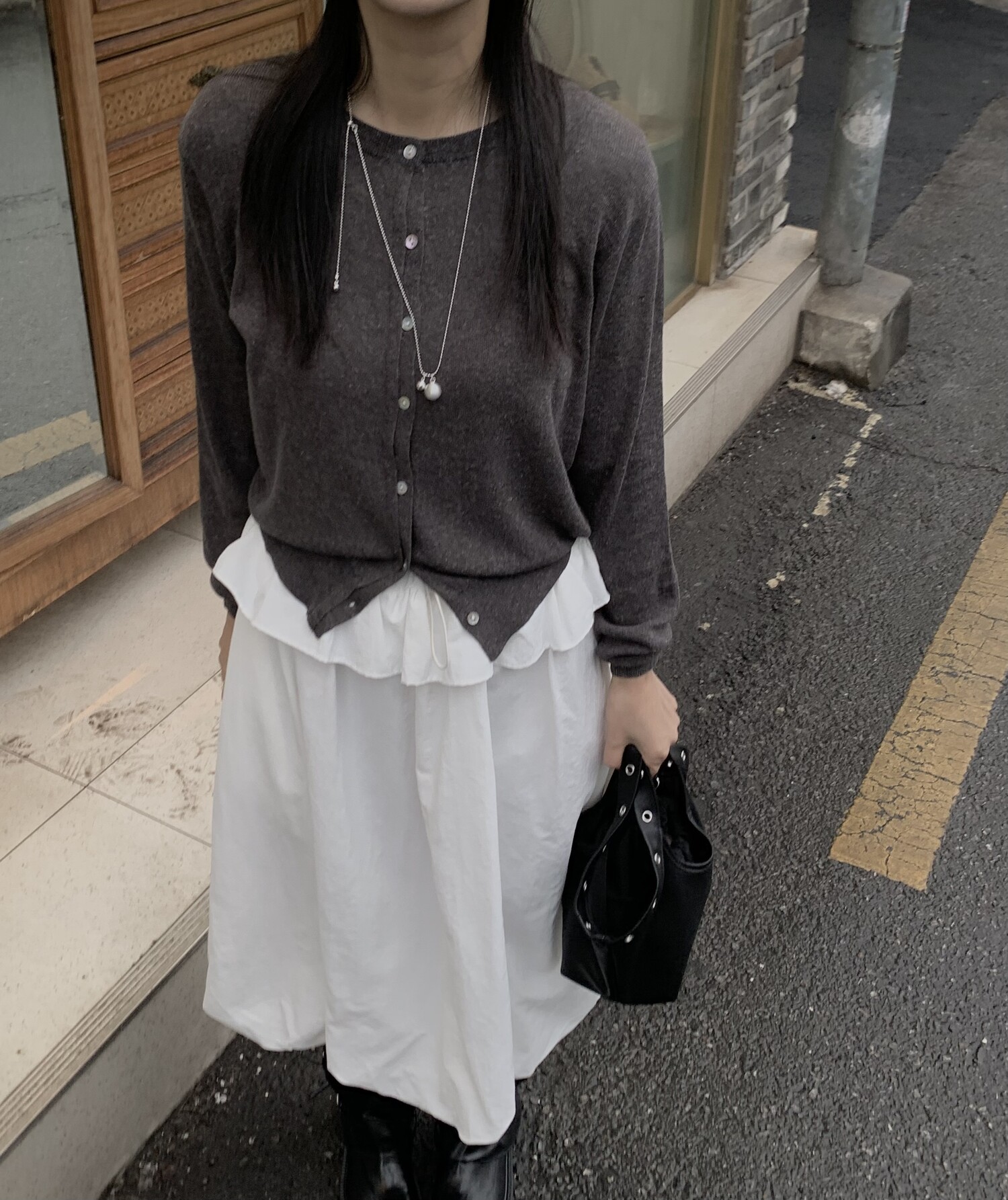 아방한 핏의 스커트를 착용하였을 때 무릎 밑의 기장감으로 떨어져 아담하신 분들도